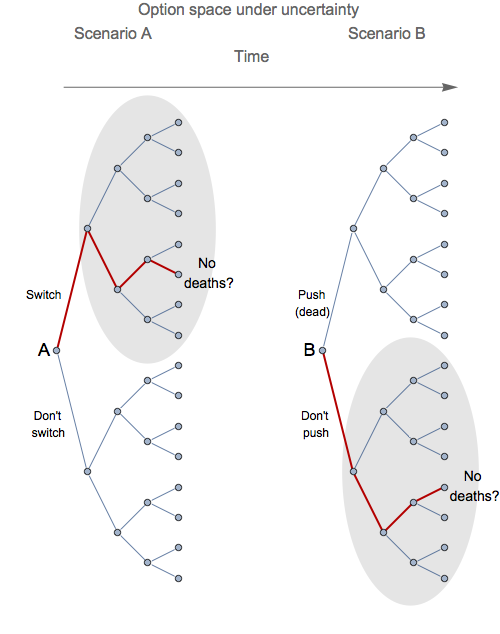 People are making choices in a way that allows them to navigate through a choice space over the irreversible dimension of time. I’ve highlighted in red a possible path for each scenario that could be envisages in the mind of somewhat making choices in a world of uncertainty. In both cases there is an unknowable chance that a resolution to the dilemma will involve no death if the dynamic choices that arise are navigated appropriately. But choosing to push the fat man in Scenario B eliminates the option of resolving the situation without any deaths.